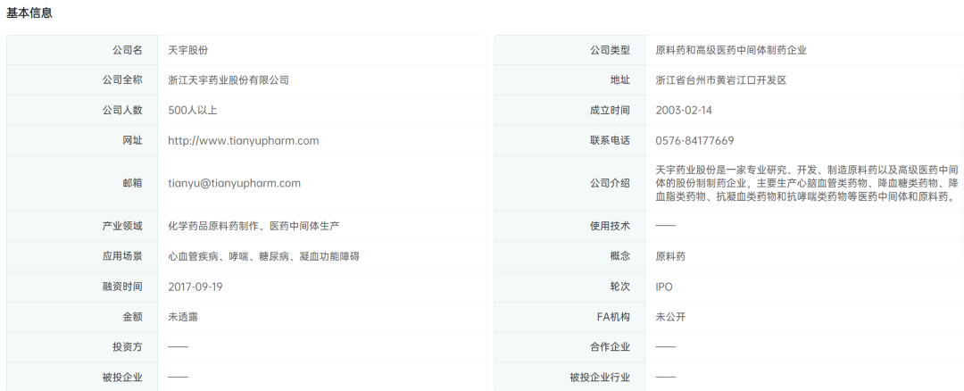 药融云数据,vip.pharnexcloud.com/?zmt-mhwz显示:浙江天宇药业股份有限公司成立于2003年,总部位于浙江台州,于2017年9月19日在深交所成功上市(股票代码:300702)。公司主要产品领域是化学药品原料药制作和医药中间体生产,应用场景为心血管疾病、哮喘、糖尿病、凝血功能障碍等。