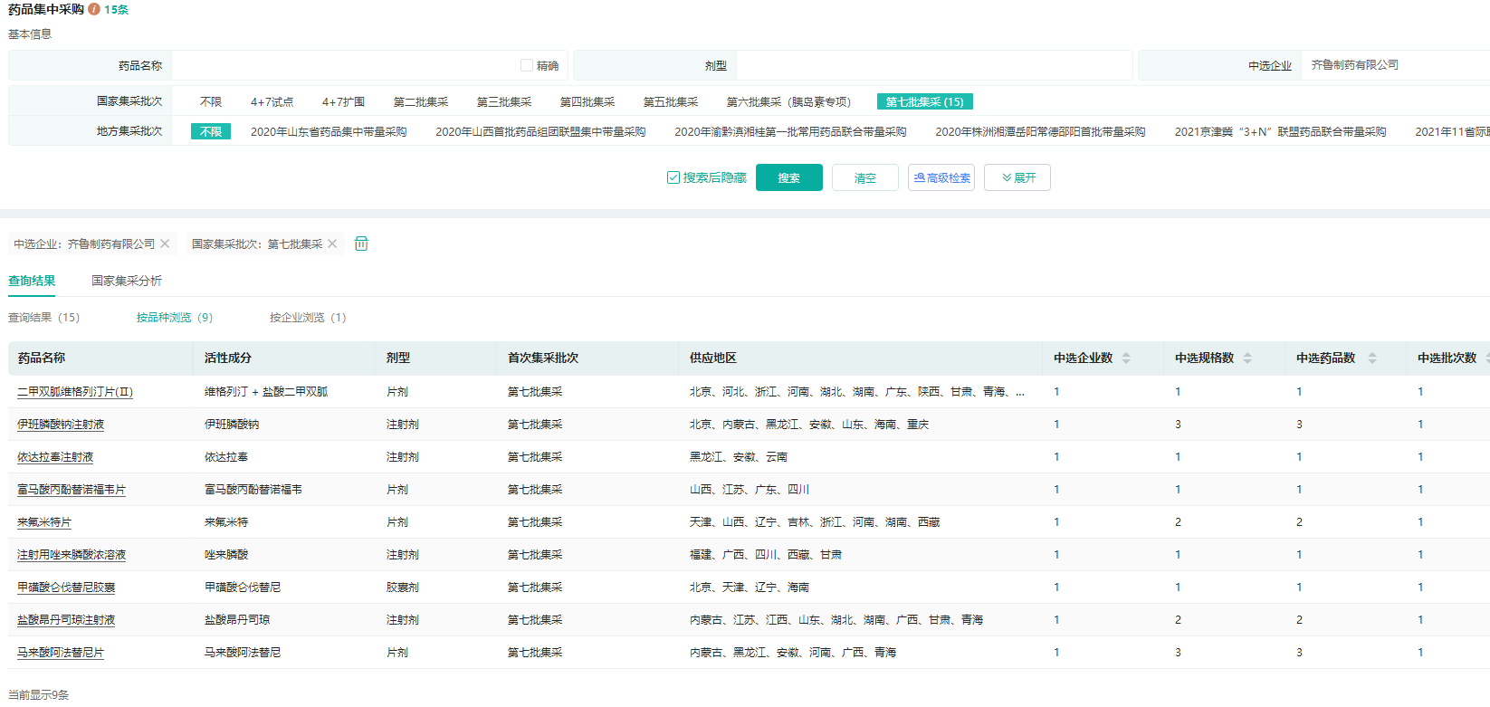 值得一提的是,第七批国家药品集采齐鲁制药中选9个品种位居榜首,分别有二甲双胍维格列汀片(Ⅱ)、伊班膦酸钠注射液、依达拉奉注射液、富马酸丙酚替诺福韦片、来氟米特片、注射用唑来膦酸浓溶液、甲磺酸仑伐替尼胶囊、盐酸昂丹司琼注射液、马来酸阿法替尼片。