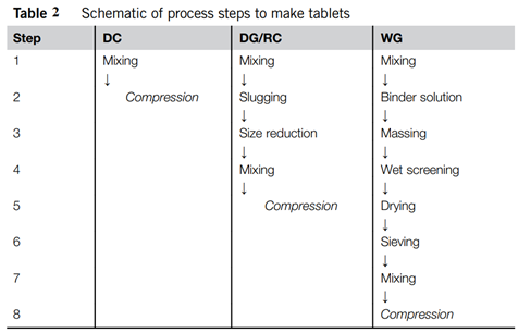 DC是生产口服片剂的最简单方法,通常用于中高剂量制剂。根据生产分类系统(MCS),需要API自身具有良好的粉体学性质,同时也需要选择合适辅料。DC乳糖等级通常是喷雾干燥的(喷雾干燥的乳糖)、粒状的(制粒乳糖)或滚筒干燥的(无水乳糖)。喷雾干燥乳糖的无定形部分非常适合制造一定强度片剂,因为它具有延展性和良好的流动性。喷雾干燥的乳糖具有非常适合中低剂量配方的形态,因为其不仅结合了出色的流动性和可压实性,而且具有非常好的混合性能,同时还可以实现出色的含量均匀度。这是由产品的形态引起的,它是一种多孔聚集体,可以将制剂的其他成分(如API)保持在孔中。然而,由于喷雾干燥乳糖的表面积很大,它可能容易过度润滑。通过流化床制粒或高剪切制粒的制粒乳糖在压实和崩解性能方面表现出非常不同的方式。由于其腔体的储存能力,这两种颗粒状产品都适用于中高剂量制剂。制粒乳糖在润滑步骤中几乎没有负面的相互作用。无水乳糖,由于其非常小的β-乳糖微晶,具有出色的压实性能,可以制造出Ts最高的片剂。