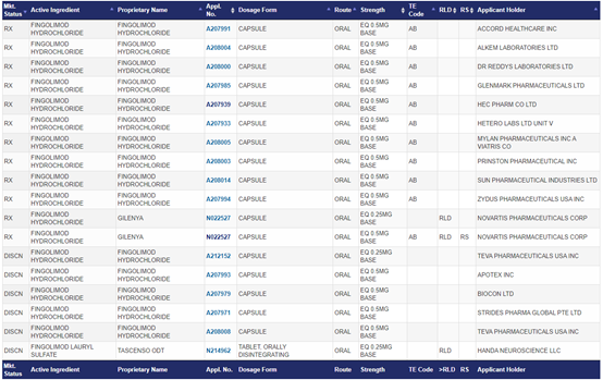 据FDA橙皮书显示,当前诺华登记的专利有三项,分别简称283、405、179号专利,其中283号专利是组合物专利,405号专利是一件新用途专利,涵盖了芬戈莫德的给药方案,179号专利是一件给药方法专利。公开报道显示283和405号专利,先后被成功无效,但是对于179号专利尚没有被成功挑战的报道。
