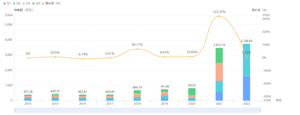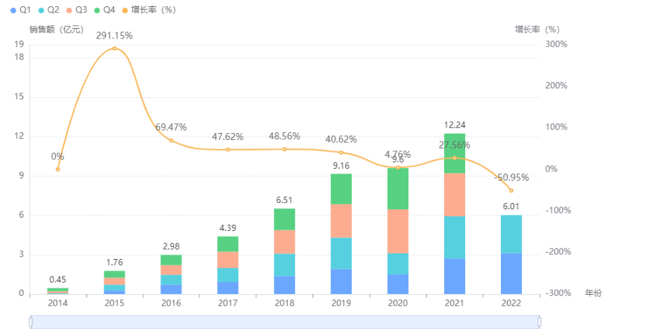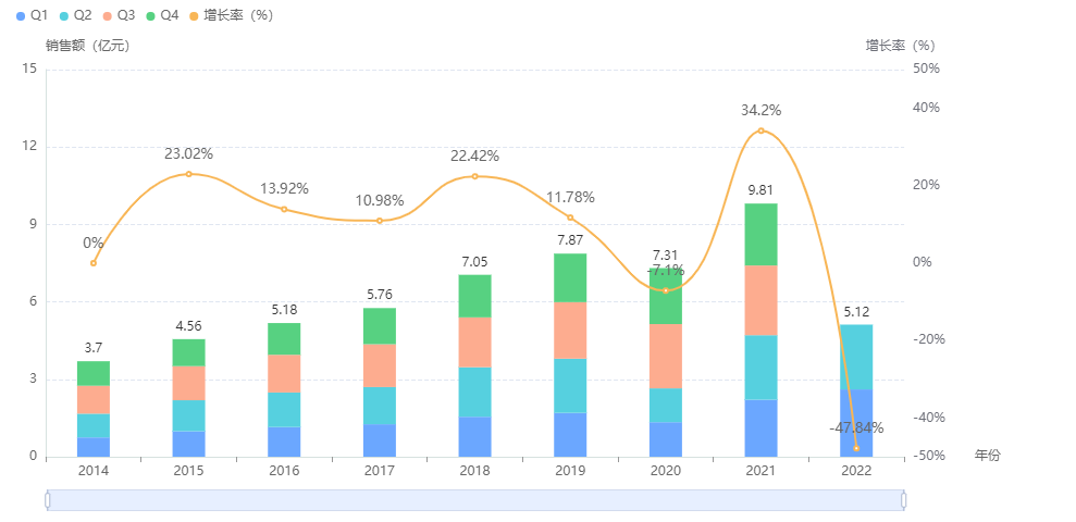 排名第四的重组牛碱性成纤维细胞生长因子是珠海亿胜生物制药的独家品种,市场上在售的重组牛碱性成纤维细胞生长因子眼用制剂均为该眼科上市公司所生产。据药融云数据统计,该药在我国院内的销售额总体呈持续递增趋势,2021年为9.81亿元。且近一两年来的季度销售额也趋于稳定,均超2.5亿,故预计2022年或可突破十亿大关。