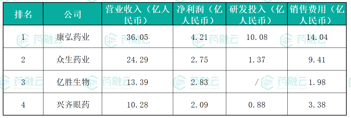 经药融云上市医药企业年报数据库查询,我们整理了四家国内眼科上市公司2021年的财报数据,并按营业收入进行了排名。排在榜首的是成都康弘药业,营业收入36.05亿人民币,净利润4.21亿,研发投入10.08亿;排在第二是广东众生药业,2021年营收24.29亿,净利润2.75亿元,研发投入1.37亿;其次是亿胜生物科技,2021年营收13.39亿,净利润2.83亿元,该公司的净利润率是最高的;最后是沈阳兴齐眼药,2021年营收10.28亿,净利润2.09亿元,研发投入0.88亿。