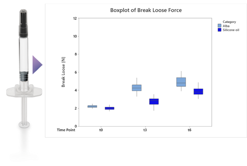 首先对加入安慰剂后的加速稳定性进行测试,以确定其启动力(见图 2)。硅油和斯蒂瓦那托集团的Alba®均表现出类似的通针性能, Alba®因特殊的涂层成分注射启动力略高。随着时间的推移, Alba®的性能在可接受和可预测范围内。