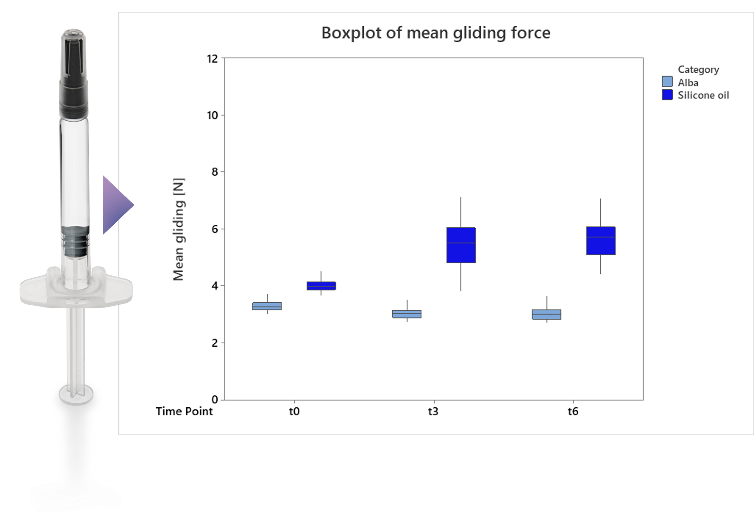 图3对比交联涂层(Alba®, 斯蒂瓦那托集团)与传统硅油涂层老化前后预灌封注射器的滑动力。