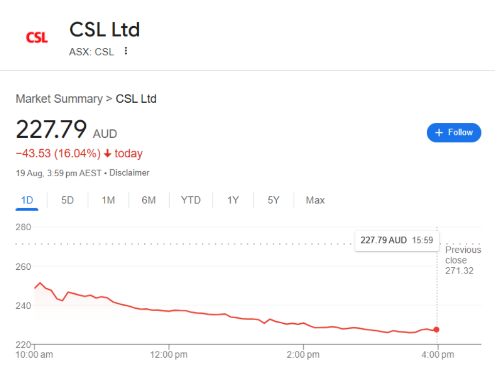作为澳交所市值排名前列的巨头公司,资本市场的反应也是立竿见影。消息公布当天,CSL股价在澳交所暴跌近17%,市值增发了200亿澳元(约合924亿元人民币)以上,更是跌破了过去6年以来的最低点。要知道,CSL一直被投资人视为“稳健增长”的代表。
