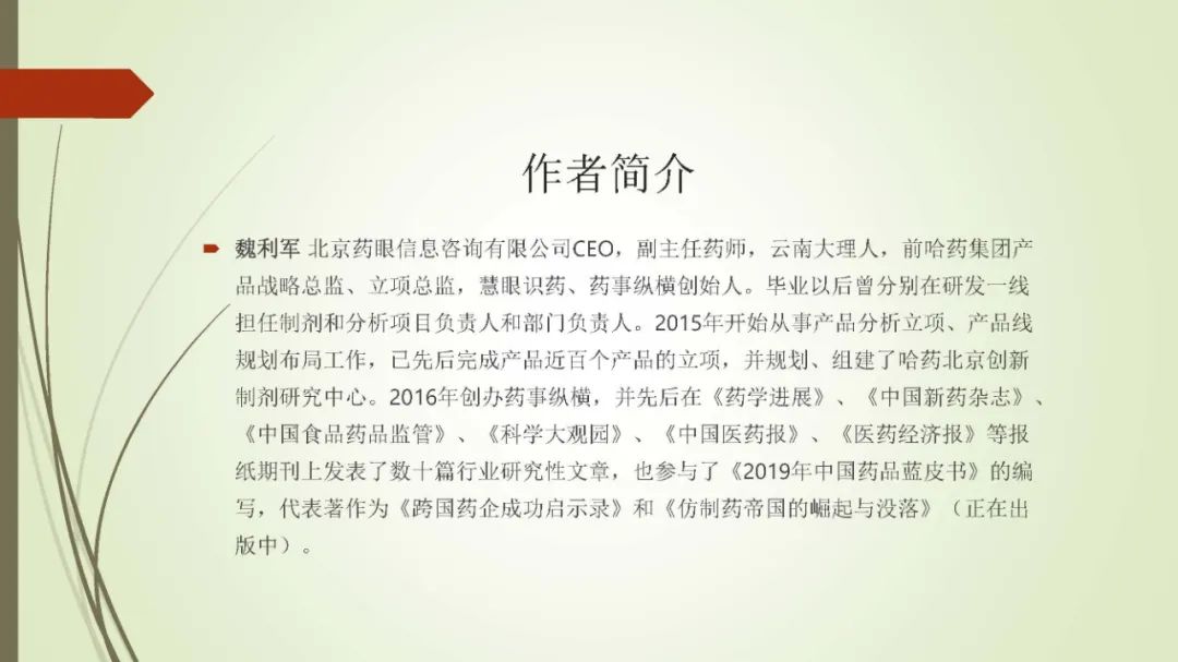 魏利军,前哈药集团产品战略总监和产品立项部总监,在过去三年中成功立项30个,并成功组建了哈药北京创新制剂研究中心。在各种杂志期刊上发表文章数十篇,代表著作为《跨国企业成功启示录》。新书《仿制药帝国的崛起与没落》主线为仿制药企业的战略规划,业务转型和产品布局。全书22章,版面字数约50-60万字。第一部分(前五章)讲述仿制药法规的衍化逻辑和市场形成机制,以及全球主要仿制市场的发展情况,第二部分(第6-20章)讲述了15家来自不同国家,不同背景,不同发家模式的仿制药企业的兴衰成败,重点介绍了他们随环境而变的风险评估,战略规划和产品线布局的逻辑,第三部分(最后两章)分别讲述我国仿制药政策的演化、市场市场形势与特点,我国仿制药企业结合国际情况的转型思考,特色化产品线规划和产品选项思路等。
