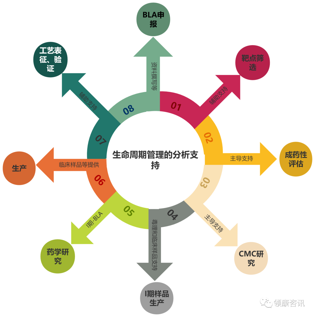 分析质控研究平台为生物制品的新药开发过程提供完整生命周期管理的分析方法支持,通过与各部门无缝隙沟通合作,从靶点筛选、成药性评估、临床前CMC研究、产品表征和产品质控、临床期间CMC研究、后期临床样品生产、工艺表征/验证、申报资料撰写等一站式生物制品开发过程提供分析支持。
