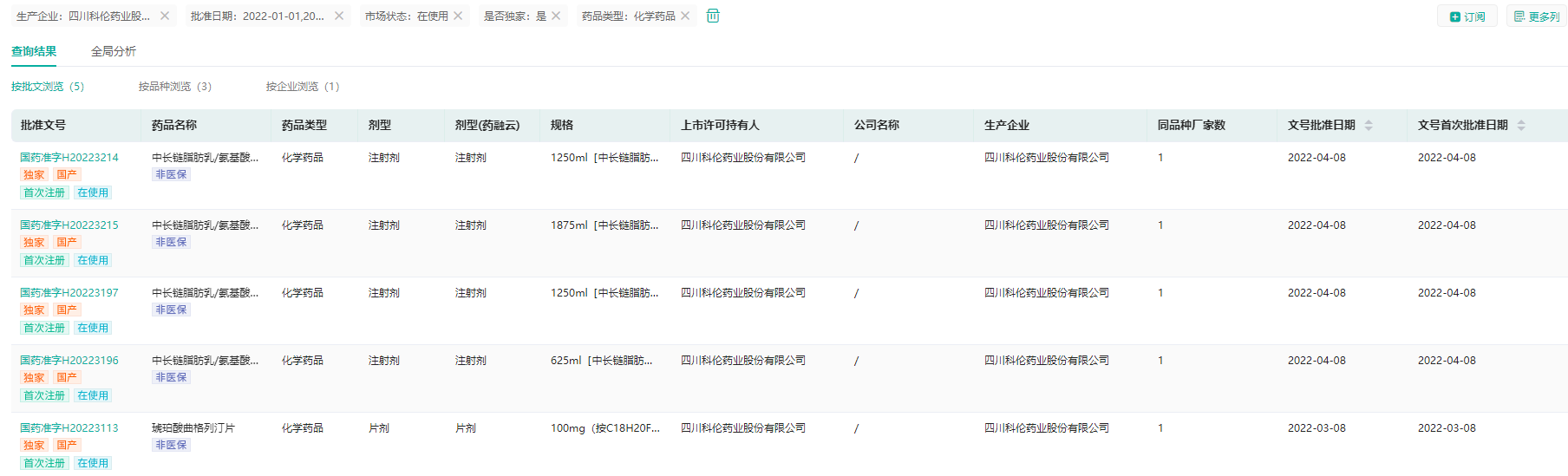 除此之外,还有五家企业在2022年获得3个独家化学药品的生产批文,包括四川科伦药业的中长链脂肪乳/氨基酸(16)/葡萄糖(30%)注射液、中长链脂肪乳/氨基酸(16)/葡萄糖(36%)注射液、琥珀酸曲格列汀片;宜昌人福药业的安那度尔注射液、氯巴占片、注射用苯磺酸瑞马唑仑;江苏恒瑞医药的昂丹司琼口腔溶解薄膜、尼莫地平口服溶液、瑞维鲁胺片;北京华素制药的甲磺酸托烷司琼、盐酸二氢埃托啡、盐酸纳曲酮;北京协和药厂的甲异靛片、三尖杉酯碱、盐酸苯氨咪唑啉片。