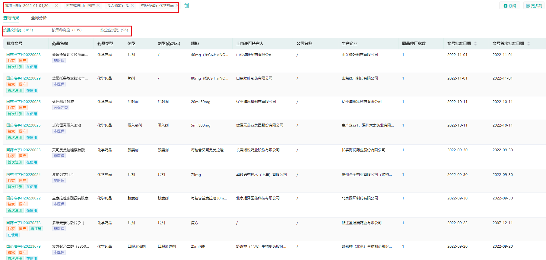 今天,我们主要来盘点一下2022年国产独家化学药品获批品种数量的TOP10企业。通过药融云中国药品批文数据库的条件筛选功能可以看到,截至目前CFDA签发了163个国产独家化学药品的批准文号,按品种维度统计是135个,按企业维度统计是96家。