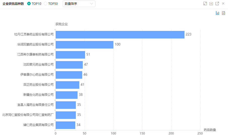 从企业获批品种数来看,排名前五的分别是:牡丹江灵泰药业(223个)、华润双鹤药业(100个)、江西希尔康泰制药(51个)、沈阳君元药业(47个)、伊春康尔心药业(46个)。