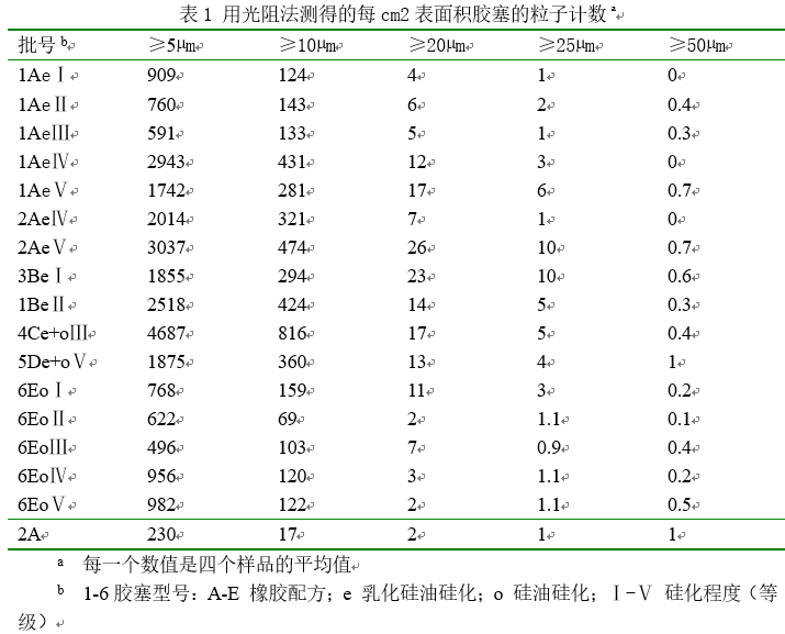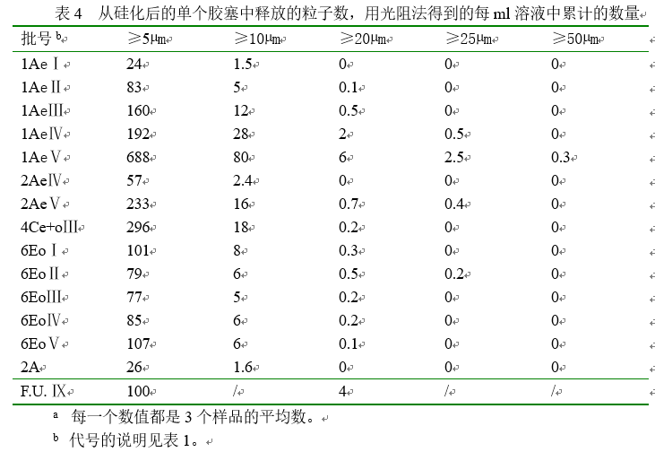 表1中列出了每平方厘米粒子的数量,它是从准备的乳液通过方法a用光阻法获得的,因为在测试的过程中二次蒸馏水的使用已经除去。在干燥期间用硅油硅化的样品6Eo是最洁净的胶塞,而微粒数量最高的胶塞出自用硅油和乳液硅化的样品4Ce+o。样品1Ae表现出随着硅化程度的提高微粒数高于平均数。用显微计数获得的微粒列表2。粒子污染的水平极低,基本上接近于空白样。这些结果确认了我们最初的假设:硅油滴在光阻法可以检测到,而在显微法中检测不到。