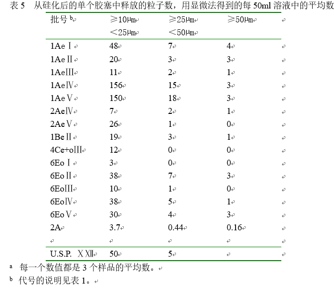 表4列出的粒子数是在使用的环境中通过光阻法获得的,数值是作为每毫升的累计平均测量值给出的,因此他们可以同官方的大容量注射液标准限度进行比较。由于使用了蒸馏水,在所有的数据中污染物质的粒子数都已被去除。这说明了粒子负荷随着乳化硅油硅化的胶塞(样品Ae)的硅化程度的增加而增加,而使用普通硅油硅化的胶塞(样品Eo)的粒子数量独立地依赖于它们的硅化程度。用乳化硅油硅化的胶塞比用硅油硅化的胶塞污染更严重,上述的Ⅲ水平已经大大超出了F.U.(1985)的标准。在正常使用环境下,在分析的每一个硅化程度的胶塞中,用硅油硅化的胶塞是洁净度平均最高的一个,这既是没有直接进行比较,在表1的结果中也有显示。表5列出的是用显微法对表4中的样品进行检测得到的污染水平,即使是在这些环境中,如果与光阻法测量的数据相比结果也是相当的低。