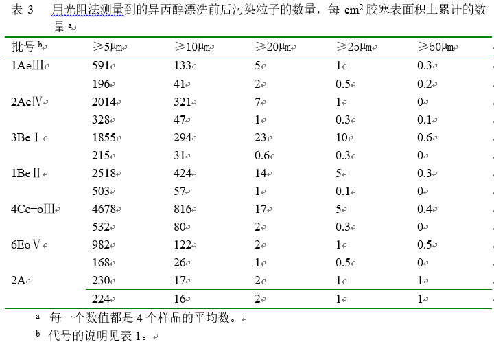 表3列出的每平方厘米胶塞表面积的粒子数量是异丙醇漂洗前后检测到的数据(方法b),数据显示对所有硅化后的胶塞,异丙醇处理后粒子数量下降的范围在70%到90%之间,并且注意到没有硅化的胶塞(2A)在污染程度上并没有改变,这就说明了异丙醇的处理不仅仅是漂洗而且是扮演了硅化抽提的角色。