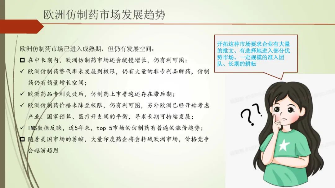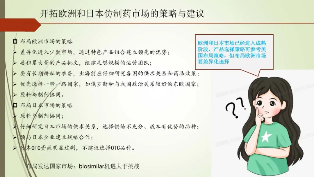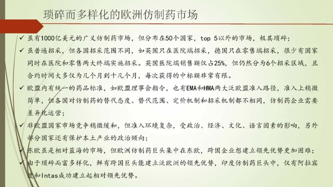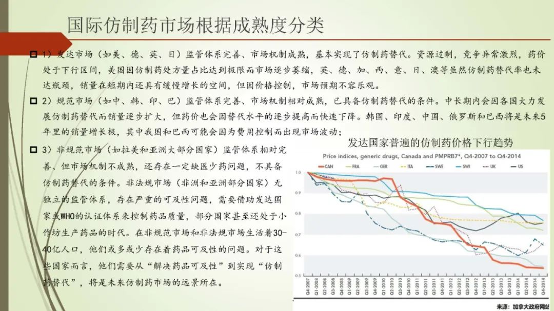 在全球范围内,发达国家市场已经步入成熟期和衰退期,竞争异常激烈,但仍有近40亿人口的国家和地区存在缺医少药的问题,他们要实现“解决可及性“到“仿制药替代”是仿制药市场发展的远景所在。基于全球仿制药市场的基本行情,本文给出以下建议,希望对各为同仁带来微薄的帮助,但也可能是野人献曝。除了出海,仿制药企业也通过提高技术门槛,将一般资源转化为相对稀缺的资源,或通过产品差异化以避开竞争的锋芒。