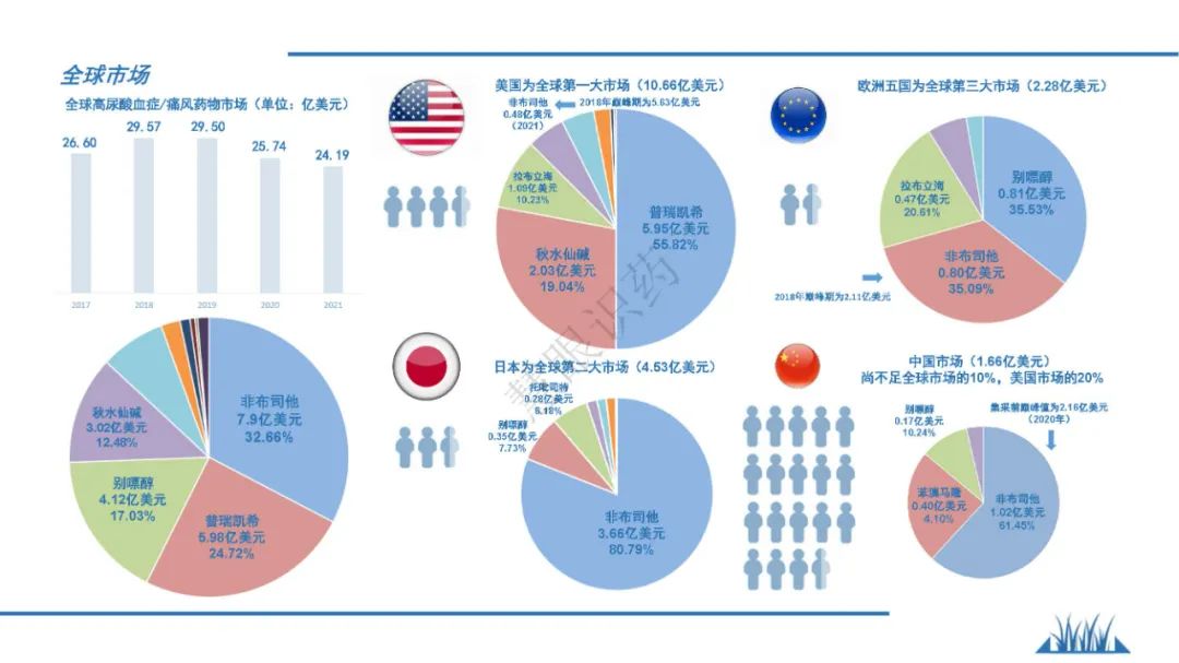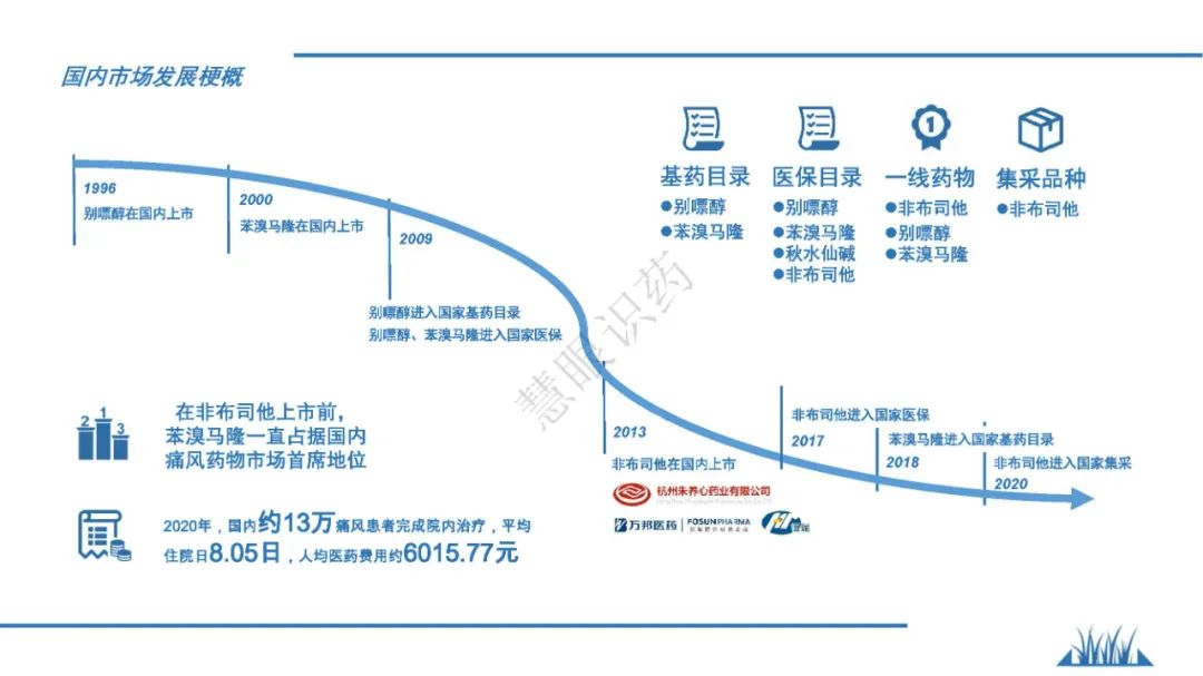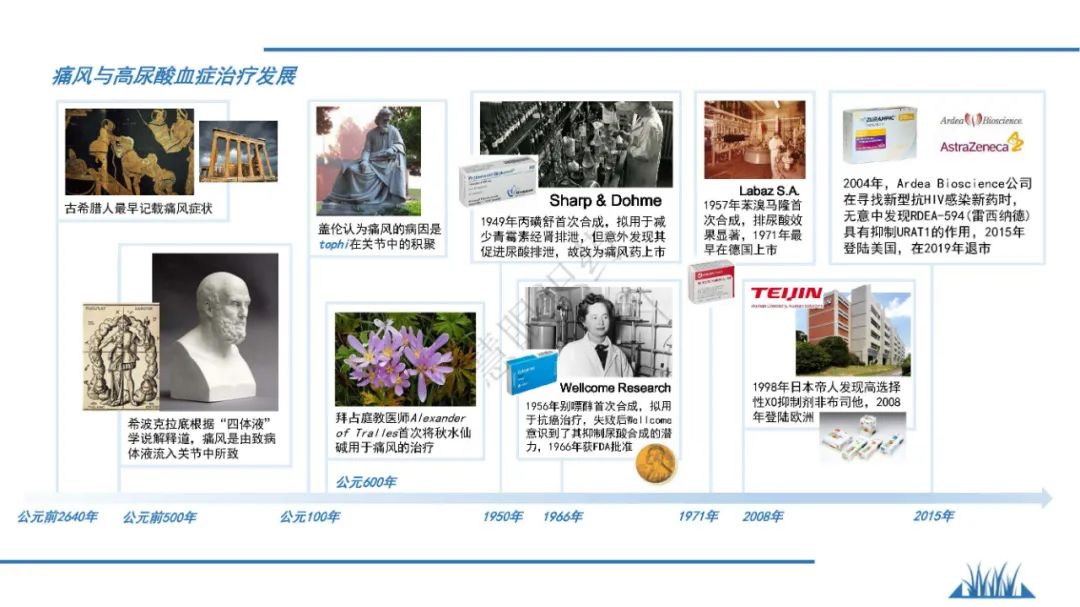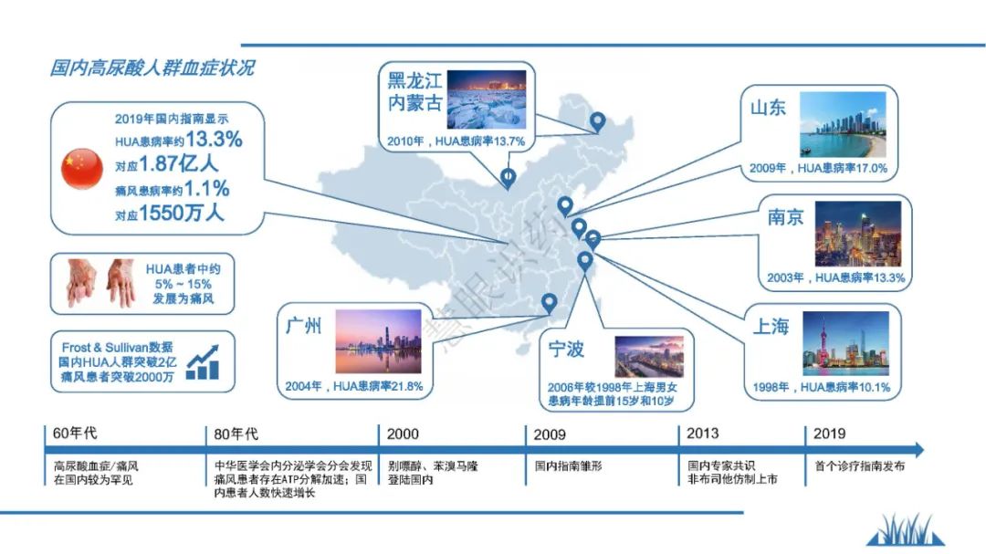 随着生活水平的升高,富含廋肉的饮食、海鲜、啤酒都是引发啤酒的主要因素,近年来,我国痛风患者有明显增多的趋势,发病年龄也有低龄化的趋势。为了让更大业内同仁了解痛风和高尿酸血症,我们系统地梳理了该治疗领域治疗历史,治疗趋势变化,也简要阐述了相关治疗用药的发展史,痛风治疗市场规模,希望广大业界同仁能够有所参考。