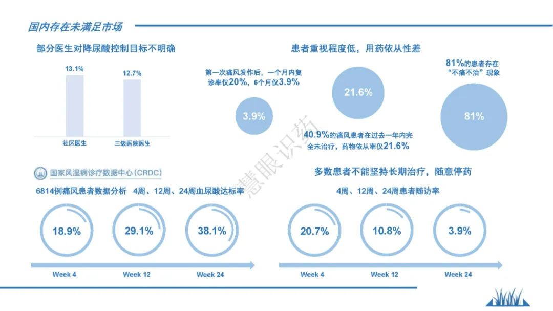 痛风是“高血压”、“高血脂”和“糖尿病(高血糖)”之外的第四高,相比三高,患者认知度低,治疗满足度也非常低。一方面是药物较少,另一方面是市场教育不够,因此痛风药仍有很大的发展空间,即便非布司他等重点产品已经集采,但院外市场依然有很大的开拓价值。