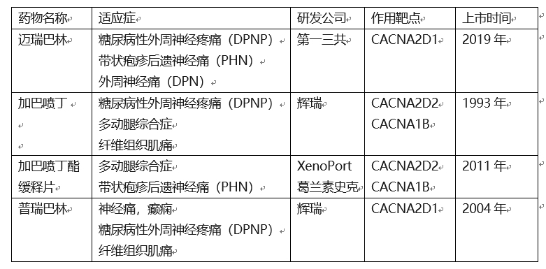 目前已上市的作用于CACNA2D的药物共有四个,均属于加巴喷丁类药物,主要用于治疗糖尿病性神经痛、带状疱疹后遗神经痛等。