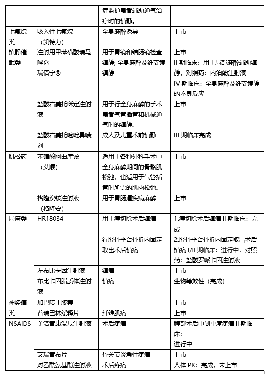 海思科静脉麻醉化药1类新药环泊酚注射液2020年上市。该产品和丙泊酚相比,使用剂量更小,恢复时间相似,产生的注射痛病例降低,心血管事件更少。