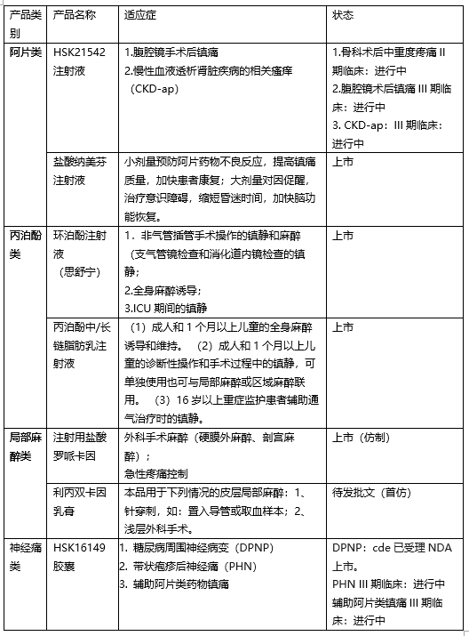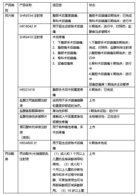 海思科医药致力于发现、开发和商业化创新型麻醉镇痛药物,持续打造由创新药组成的镇痛产品管线;恒瑞医药和人福医药在疼痛领域各个细分市场广泛布局,通过小分子创新及改良型新药开发,为麻醉镇痛药市场增加更多的品类,它们均为全球疼痛患者提供更多的治疗选择。