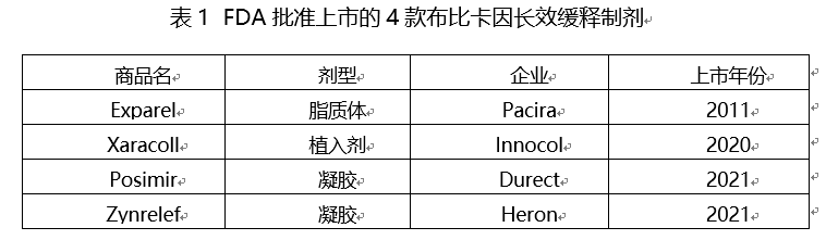 国外已上市的4款布比卡因长效缓释制剂中,分别为脂质体Exparel、植入剂Xaracoll、以及凝胶剂Posimir和Zynrelef,其中Zynrelef为布比卡因和美洛昔康的复方制剂。