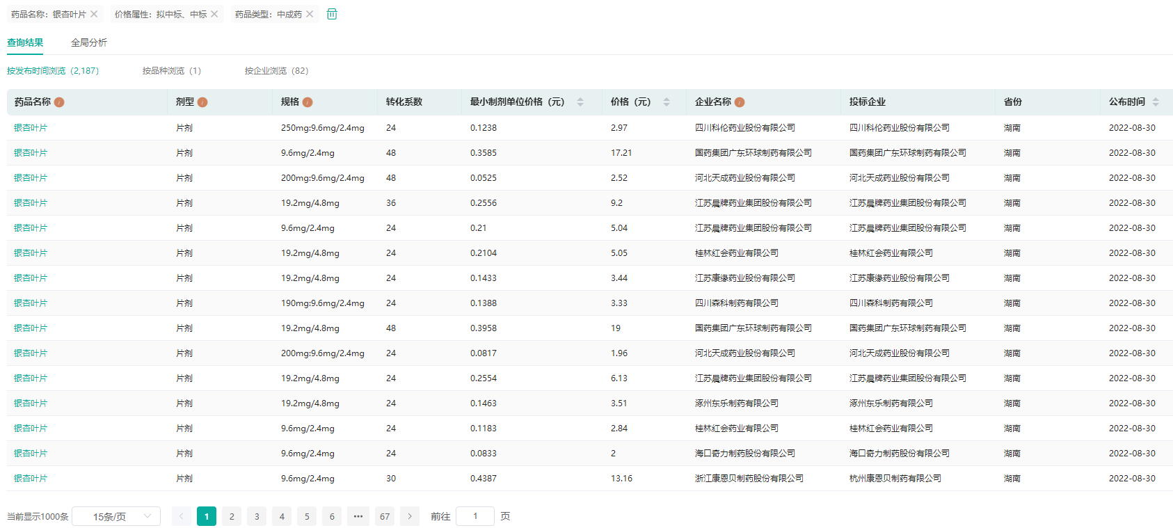 银杏叶片拟中标/中标结果查询数据(部分)