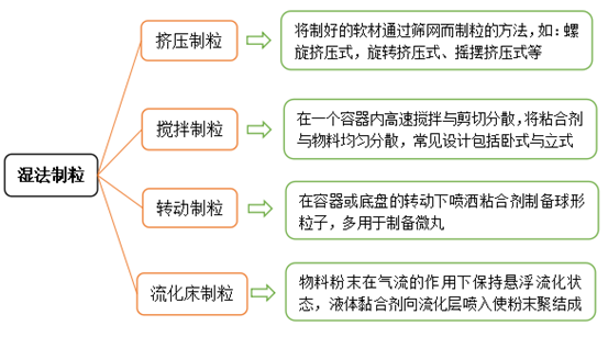 湿法制粒是在粉状物料中加入适宜液体润湿剂制备颗粒的方法。常用的润湿剂可以是水、乙醇、等其他溶剂,也可以是粘合剂以一定比例配制的溶液。粉末通过粘合剂的架桥或粘结作用聚结在一起,并在机械外力的作用下分离为具有一定大小和形状的颗粒。根据作用机械外力的方式,湿法制粒可以分为以下几类: