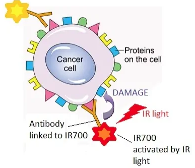 由于添加了光反应物质,Akalux在与肿瘤靶向结合之后,可以在局部被由光导纤维释放的红色激光激活,从而导致肿瘤细胞的死亡。其独特之处在于,利用抗体介导的靶向递送实现高度肿瘤特异性,同时利用激光激活生物物理机制精确地诱导癌细胞的快速死亡,且避免伤害周围正常组织。