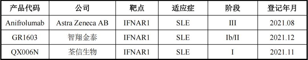 再如系统性红斑狼疮,针对该病的现有疗法仍存在反应率不足、复发风险高、生物治疗药物选择受限以及生物治疗在疾病早期阶段的可及性受限等问题,而当前全球抗IFNAR1单抗中,仅有阿斯利康公司研发的阿尼鲁单抗(Anifrolumab)已在美国获批上市,尚无国产抗IFNAR1单抗获批,因此该疾病领域依然存在未满足的临床需求。智翔金泰自主进行抗体药物研发的GR1603为国内企业首家进入I期临床试验的抗IFNAR1单克隆抗体药物。