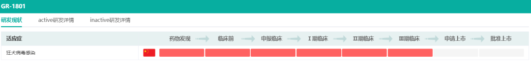 临床前研究显示,GR1801对体内外实验中采用的所有毒株(分布于三个狂犬病毒进化群)均具有中和活性。在疫苗完全发挥主动保护作用前,一定剂量的GR1801对多种亲缘性较远的狂犬病毒攻毒小鼠可实现100%的保护。