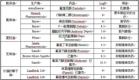 油特别适合易水解型原料药,且载体油在注射后具有较高的生物相容性,特别是应用超精炼油可以减少水溶性化合物的氧化和水解。对于油溶液型长效注射剂产品,其配方、制造和杀菌简单,长期稳定性好。表1总结了已批准的油溶型产品最常用的载体油种类。