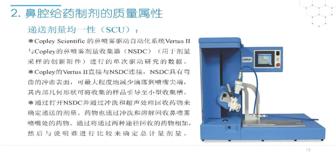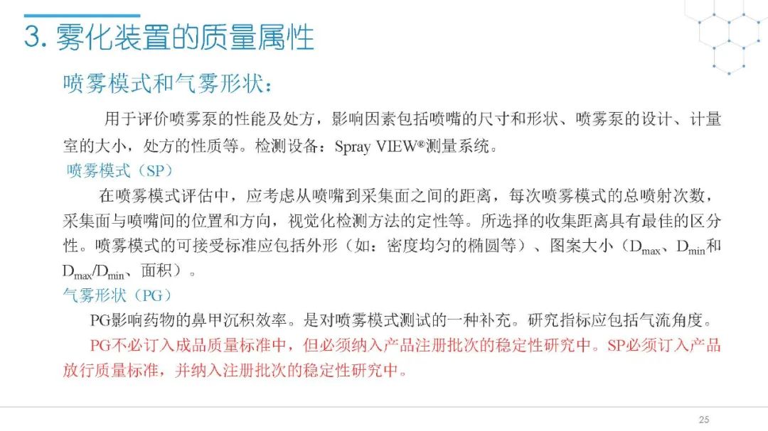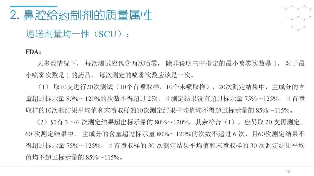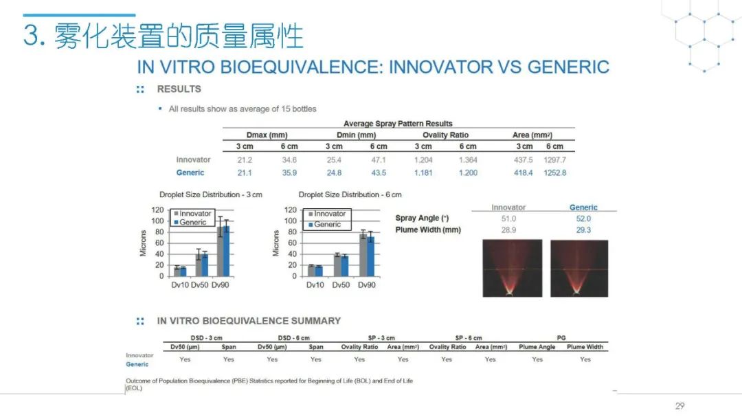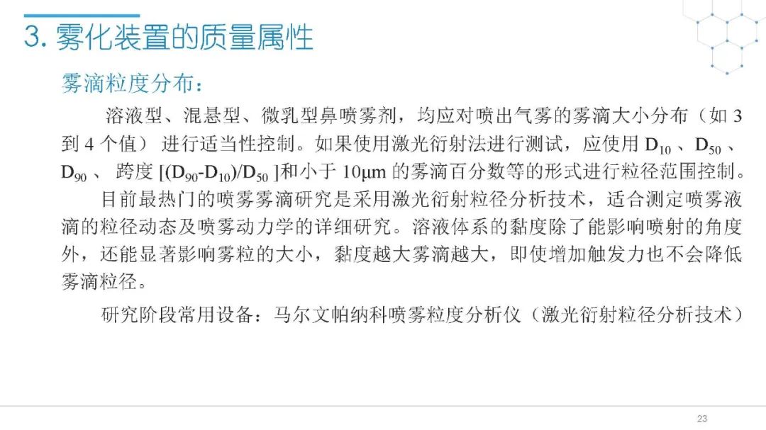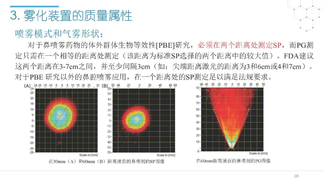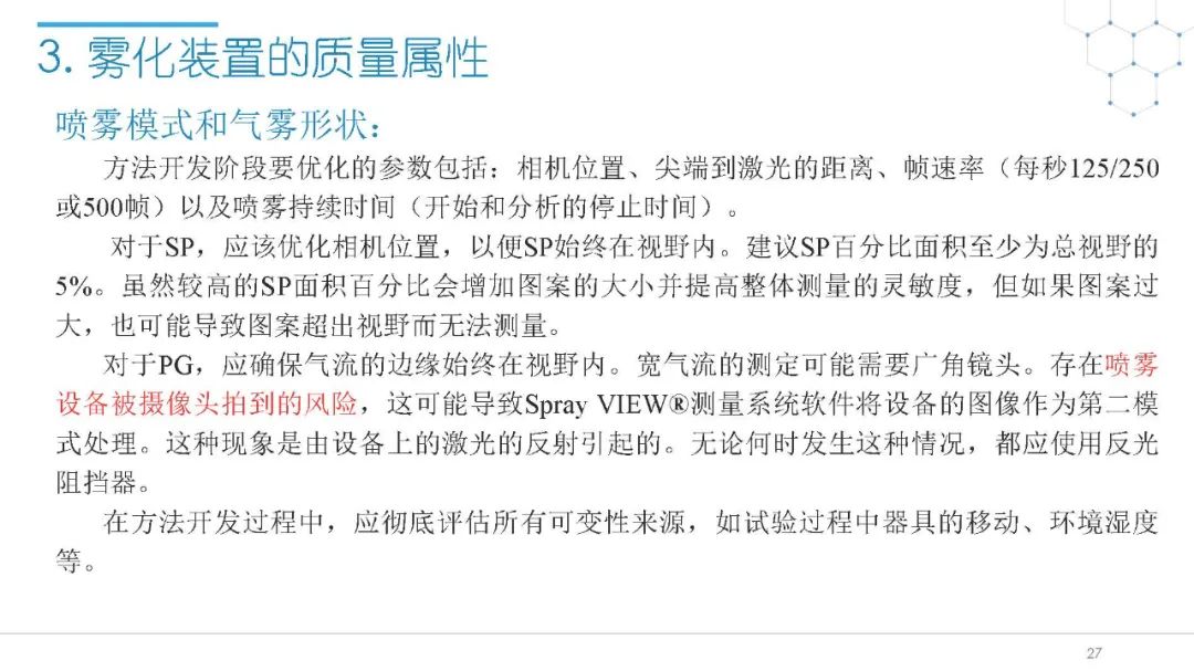 随着国内改良型制剂的发展,越来越多的医药公司把部分研发重心转向开发鼻腔给药制剂。但关于鼻腔给药制剂与传统的口服固体制剂、注射剂的质量研究又存在些许差异,关于这方面的剖析相对较少。本节就鼻喷制剂的分析检测和现有的鼻腔喷雾产品的监管要求进行了回顾与讨论。特别强调了一些关于鼻腔喷雾产品的体外表征和体外群体生物等效性方面的研究,主要包括喷雾模式(SP:Spray Pattern)和气雾形状(PG:Plume Geometry,喷雾几何形状;又称喷雾角度Spray Angle)。此外,还对鼻腔给药制剂的给药装置、特殊检项和控制标准、表征设备和原理(表征方法开发、优化的注意事项:如相机位置、尖端到激光的距离、相机帧速率以及喷雾持续时间)、鼻喷制剂的溶出(包括装置、溶出介质及介质配制)进行了简要介绍。并以实际案例介绍了仿制药开发过程中的喷雾模式(SP)和气雾形状(PG)的对比研究,这也是鼻喷制剂体外生物等效性的研究核心。
