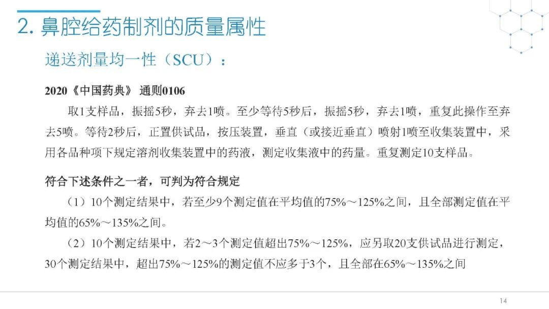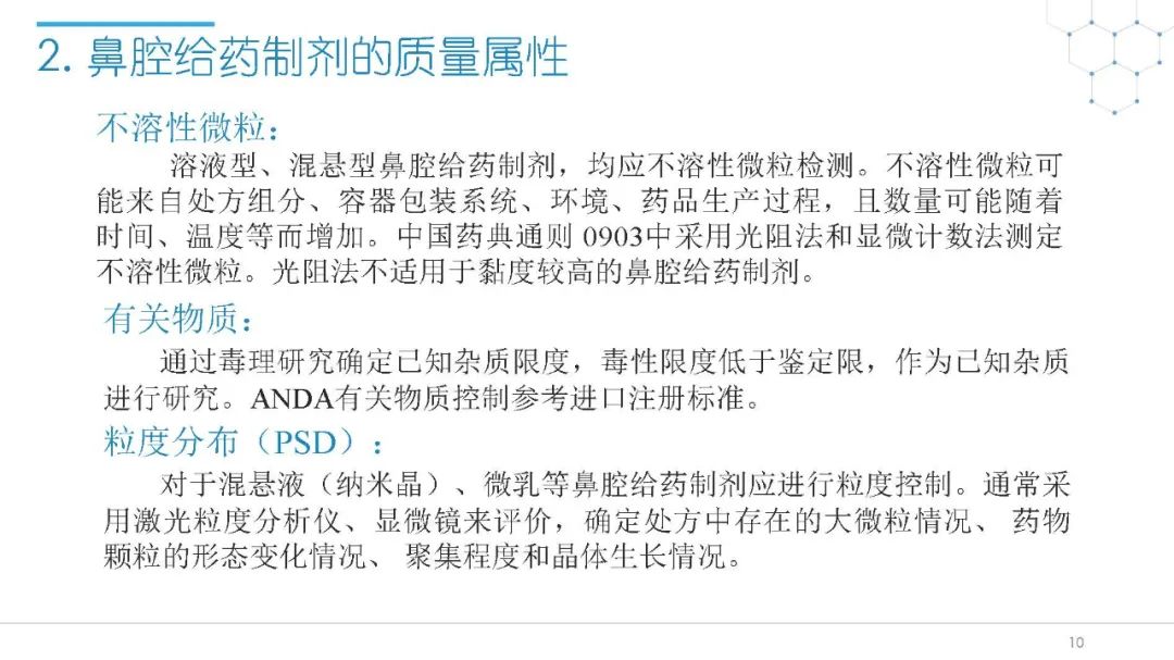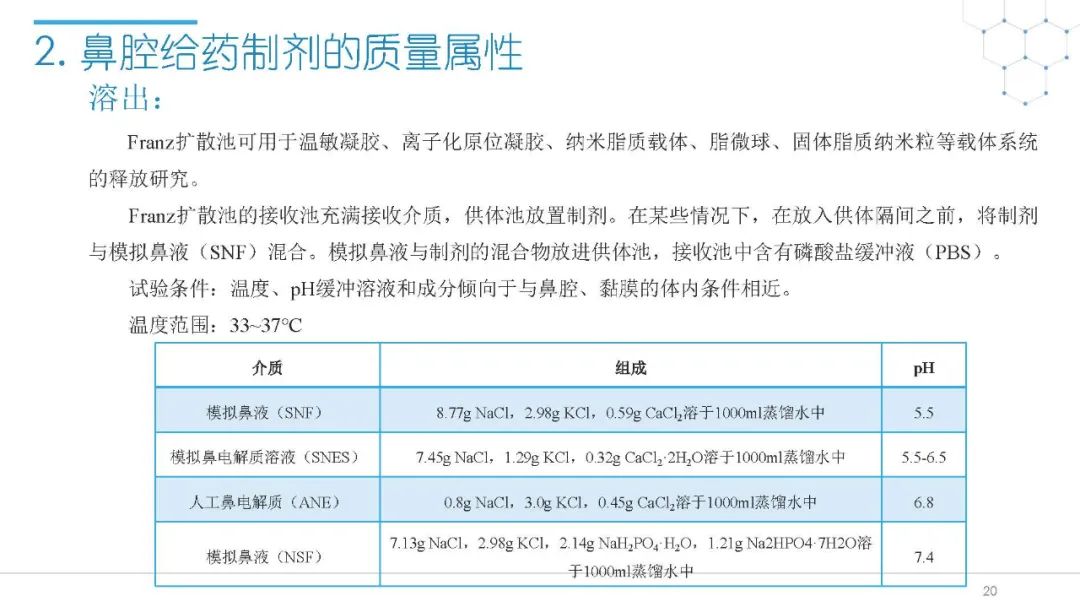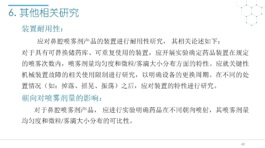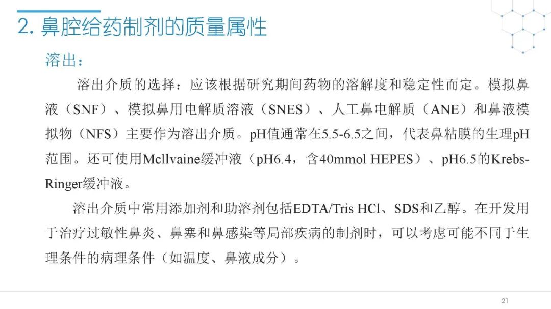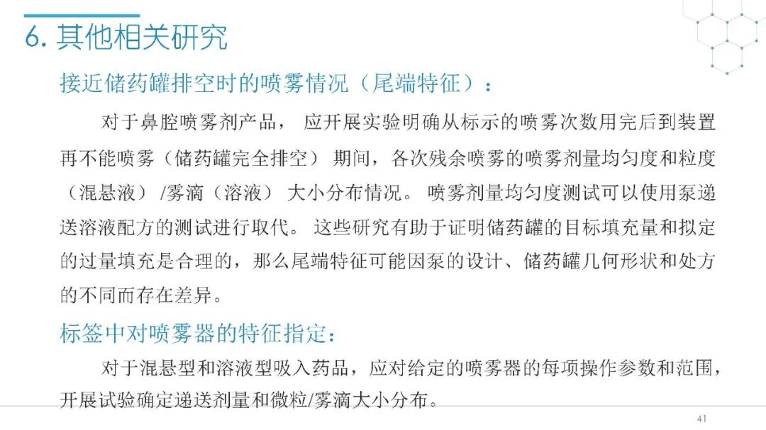 随着国内改良型制剂的发展,越来越多的医药公司把部分研发重心转向开发鼻腔给药制剂。但关于鼻腔给药制剂与传统的口服固体制剂、注射剂的质量研究又存在些许差异,关于这方面的剖析相对较少。本节就鼻喷制剂的分析检测和现有的鼻腔喷雾产品的监管要求进行了回顾与讨论。特别强调了一些关于鼻腔喷雾产品的体外表征和体外群体生物等效性方面的研究,主要包括喷雾模式(SP:Spray Pattern)和气雾形状(PG:Plume Geometry,喷雾几何形状;又称喷雾角度Spray Angle)。此外,还对鼻腔给药制剂的给药装置、特殊检项和控制标准、表征设备和原理(表征方法开发、优化的注意事项:如相机位置、尖端到激光的距离、相机帧速率以及喷雾持续时间)、鼻喷制剂的溶出(包括装置、溶出介质及介质配制)进行了简要介绍。并以实际案例介绍了仿制药开发过程中的喷雾模式(SP)和气雾形状(PG)的对比研究,这也是鼻喷制剂体外生物等效性的研究核心。