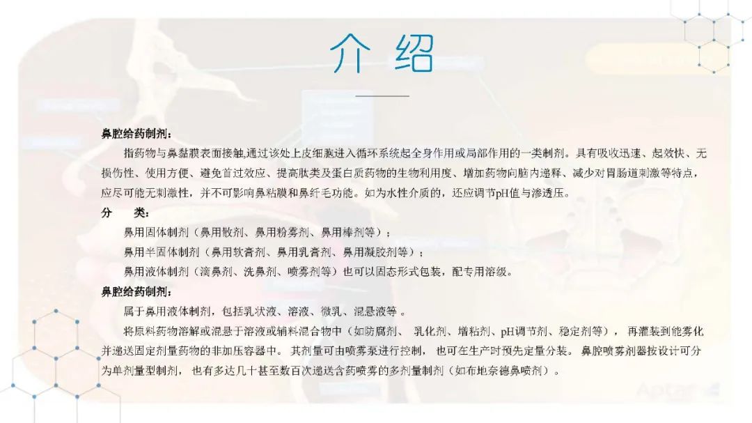 鼻腔给药在局部、全身和潜在的中枢神经系统递送方面具有独特的优势:鼻甲具有丰富的血管并有较大的表面积,使得鼻腔给药成为系统性疾病药物的理想给药部位;药物通过鼻腔黏膜迅速吸收,剂量低,可快速起效;避免了口服固体制剂的缺点,即避免了首过代谢效应和与其他器管相互作用引起的副作用;鼻腔给药更加便利和安全;鼻腔给药可作为口服或静脉给药的辅助给药。