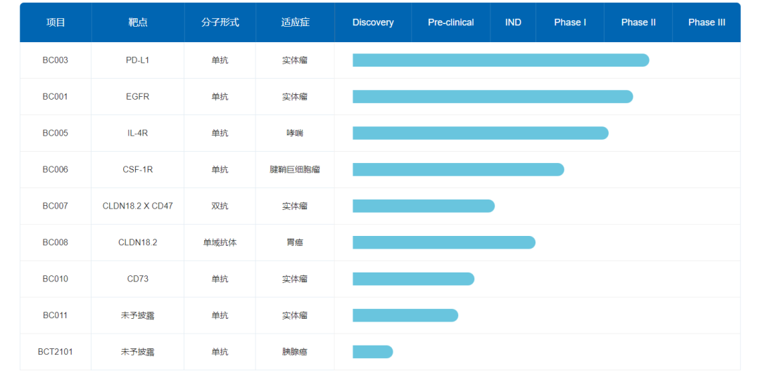 据药融云数据库显示,CDE目前已累计受理了8条宝船生物递交的药品申报信息,包括1类新药申报临床:BC007抗体注射液、BC006单抗注射液、MG-K10人源化单抗注射液、全人源抗PD-L1抗体注射液;2.4类新药申报临床:重组抗EGFR人鼠嵌合单克隆抗体注射液,现均在审评审批中。