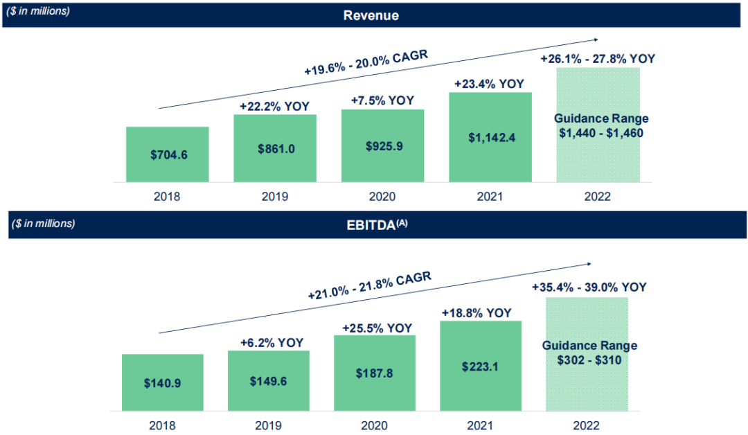 代表着生命科学领域研发和创新的主力军,新兴生物制药公司在过去的5年中,临床试验数量翻倍,研发管线数量增加。有报告指出,新兴生物制药公司的管线数量占目前在研管线总数的70%以上,且增长的趋势依然持续。而这些公司大部分为中小型规模,也就是Medpace的目标客户,因此受益于这些企业医药外包投入的高速增长,Medpace的营收维持较高增速,2021年总收入达11.42亿美元,预计2022年将达到14.4~14.6亿美元,近五年复合年均增长率约为19.6%~20%。