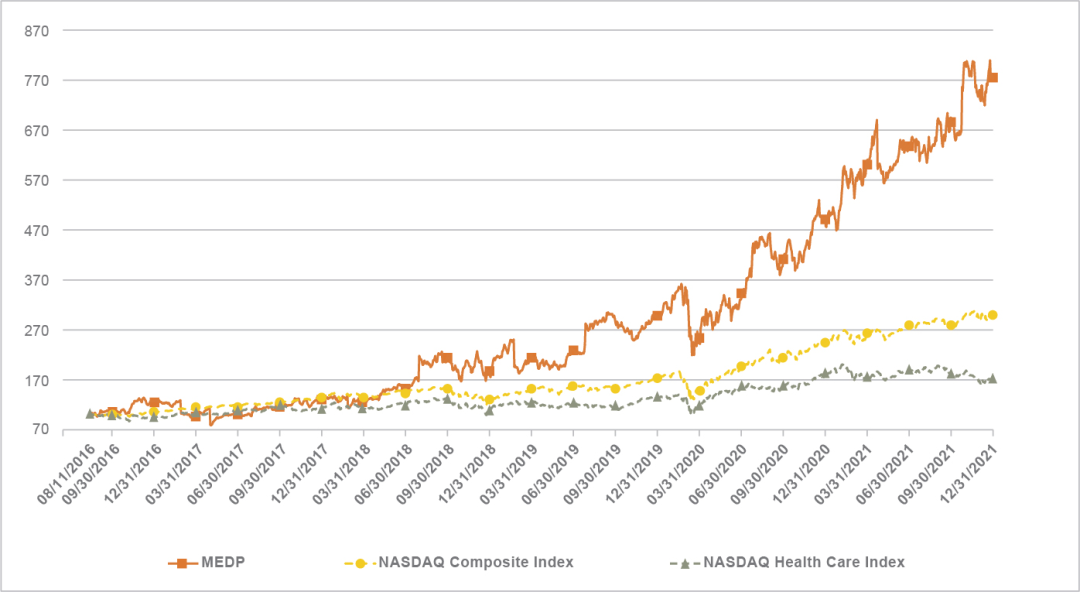 下图为2016年8月11日至2021年12月31日期间纳斯达克综合指数、纳斯达克医疗保健指数和Medpace(NASDAQ: MEDP)普通股累计股东总回报的对比。(仅供参考)