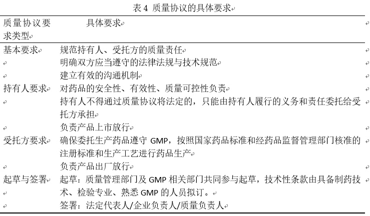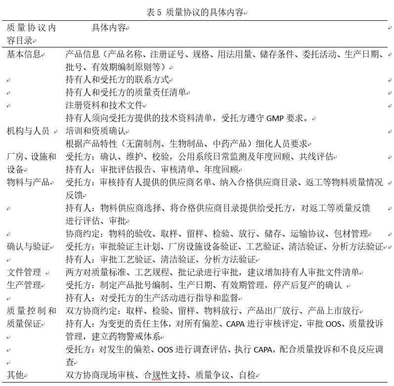 质量协议的具体内容梳理如表5所示,质量协议的内容应该进行文件标准化,并对双方相关人员进行培训,委托方与受托方应建立良好的沟通,以书面形式记录质量沟通结果,并由双方审核签字。