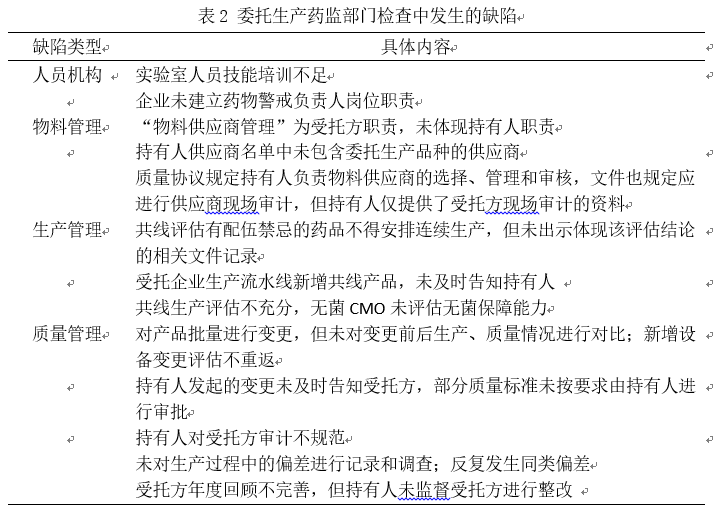由于委托生产导致了质量事件屡见不鲜,如广东怡康制药委托韶关市居民制药生产抗骨增生片,由于受委托企业存在中西药生产交替共线,清场不彻底等问题,导致抗骨增生片与氯芬黄敏片发生了交叉污染,两家企业都被收回了GMP证书。美国新基生物医药委托美国当地一家公司生产注射用紫杉醇,国家局在境外委托生产现场检查发现部分关键生产设施不符合中国GMP,存在生产过程无菌控制措施不到位等问题,遭到产品暂停出口、销售、使用,市场被国内企业占领,失去原本拥有的市场绝对主导权。委托生产药监部门检查中发生的缺陷如表2所示。