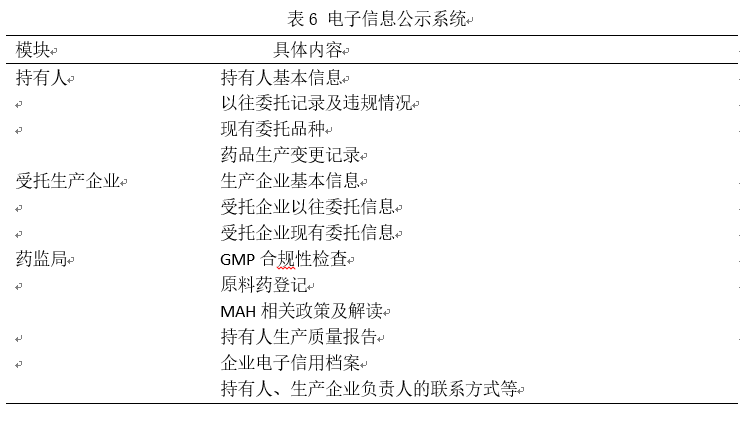 信息流通。通过该数据库, 药监部门应当对将检查的药品资料有一个清晰的认识, 对需要检查的内容也能有的放矢。该数据库也使药品持有人可以随时跟进委托药品的生产和相关检查情况。此外, 为了避免各地药监部门对委托药品消极检查的情况, 建议设立相应的协调部门或专业负责各地监管政策沟通部门, 确保各地监管政策能有序衔接, 信息公示系统的相关模块与内容见表6。