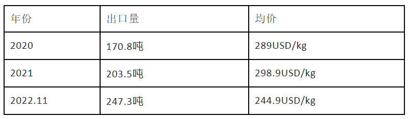 据出口数据显示,我国熊去氧胆酸2020年出口170.8吨,均价为289USD/kg;2021年出口203.5吨,均价为298.9USD/kg;2022年前11个月出口247.3吨,均价为244.9USD/kg。