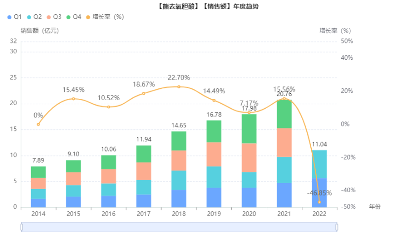 国内市场在售的熊去氧胆酸品种有熊去氧胆酸胶囊、熊去氧胆酸片、牛磺熊去氧胆酸胶囊以及熊去氧胆酸软胶囊。据药融云统计,熊去氧胆酸在我国院内的销售一直处于持续递增趋势,于2021年突破了二十亿大关。其中,熊去氧胆酸胶囊为市场的主力品种,占据超七成的销售额,且国内大部分的熊去氧胆酸胶囊都由德国福克大药厂生产,故德国福克大药厂在国内熊去氧胆酸市场中的地位也举足轻重。