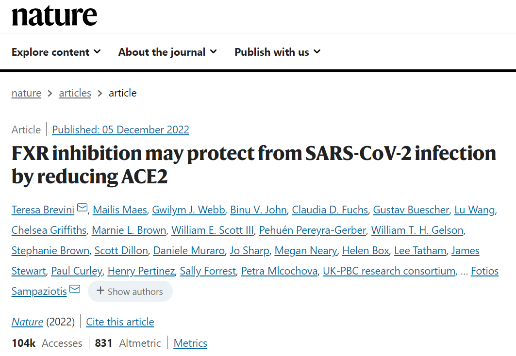 [1]Brevini, T., Maes, M., Webb, G.J. et al. FXR inhibition may protect from SARS-CoV-2 infection by reducing ACE2. Nature (2022). https://doi.org/10.1038/s41586-022-05594-0