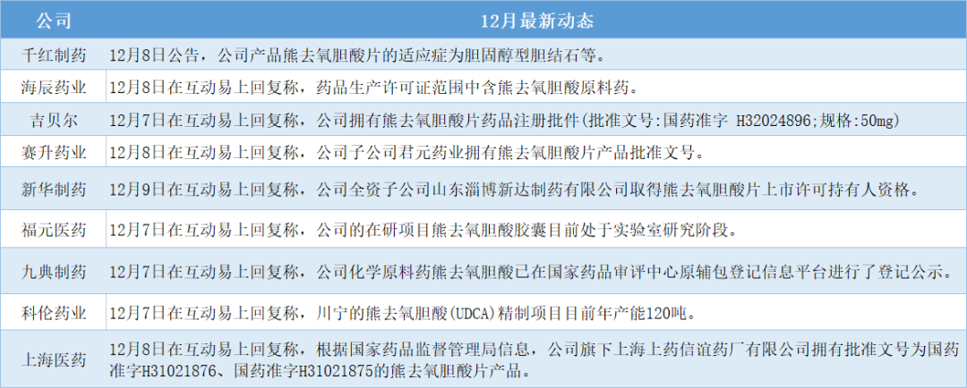 目前,国内涉及熊去氧胆酸生产环节的公司主要有:宣泰医药、川宁生物、千红制药、海辰药业、上海凯宝、广生堂、众生药业、吉贝尔、赛升药业、华润双鹤、新华制药、福元医药、人福医药、九典制药、上海医药等。