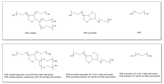 前面提到吐温80其实是一种混合物,市售的预期结构聚氧乙烯脱水山梨糖醇单油酸酯)仅占吐温80总量的20%。如图2所示,异质性主要来来源与工艺相关的副产物杂质,其中不仅含有单酯(预期结构),还含有二酯、多酯,甚至未成酯的脂肪酸链。此外,前面还提到(见图1),吐温80可以发生水解反应及氧化反应导致降解,产生脂肪酸链及氧化物,以上导致对吐温80的表征成为了难点。