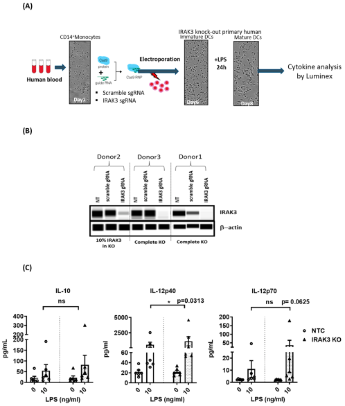 通过CRISPR/Cas9基因编辑技术和PROTAC选择性降解IRAK3来研究后续DCs中功能和表型变化。根据下图在人单核细胞衍生的树突状细胞中基因编辑敲除IRAK3基因,采用基于毛细管电泳技术Digital Western(也称为Simple Western)验证基因敲除效率,2个供体显示完全敲除,另一个显示保留10% IRAK3蛋白表达,结果显示通过CRISPR/Cas9 RNP方法有效降低了DCs中IRAK3蛋白表达水平。敲除了IRAK3后,在脂多糖(LPS)刺激后,通过检测细胞上清液中细胞因子分泌水平,结果显示IL-12p40分泌显著增加,与对照相比,浓度增加了1.5到2倍。同时IL-12p70分泌也具有增长趋势,但IL-10没有影响。