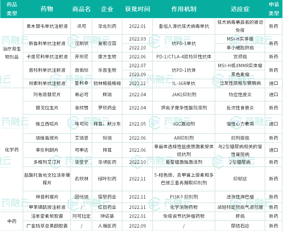 2022年完结在即,据药融云数据库,截至2022年12月27日,今年已经有50多款新药在中国获批,其中包括16款1类新药。获批上市的1类新药中有4个进口新药和12个国产新药。