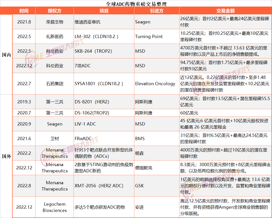我们整理了2020-2022年ADC药物项目相关重磅交易,如下表: