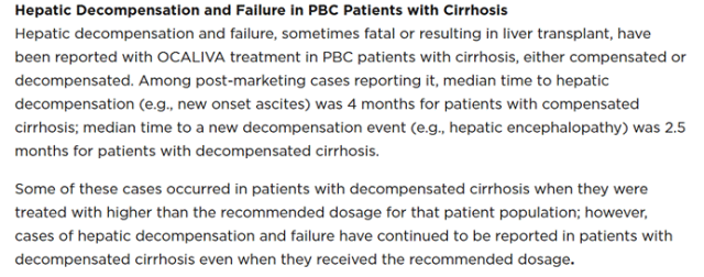 据报道,使用OCALIVA的肝硬化患者,不论代偿期还是失代偿期,出现肝失代偿和肝衰竭,有些导致死亡或肝移植。上市后数据显示,代偿期患者发生失代偿(如新发腹水)的中位时间为4个月;失代偿期患者出现新事件(如肝性脑病)的中位时间为2.5个月。