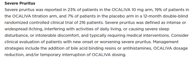 严重瘙痒也是常见问题。一项12个月的双盲随机试验显示,OCALIVA 10 mg组有23%患者出现严重瘙痒,滴定组为19%,安慰剂组为7%。严重瘙痒定义为干扰日常生活或睡眠、需医疗干预的剧烈症状。建议应对方式包括加用树脂或抗组胺药、减量或暂停服药。