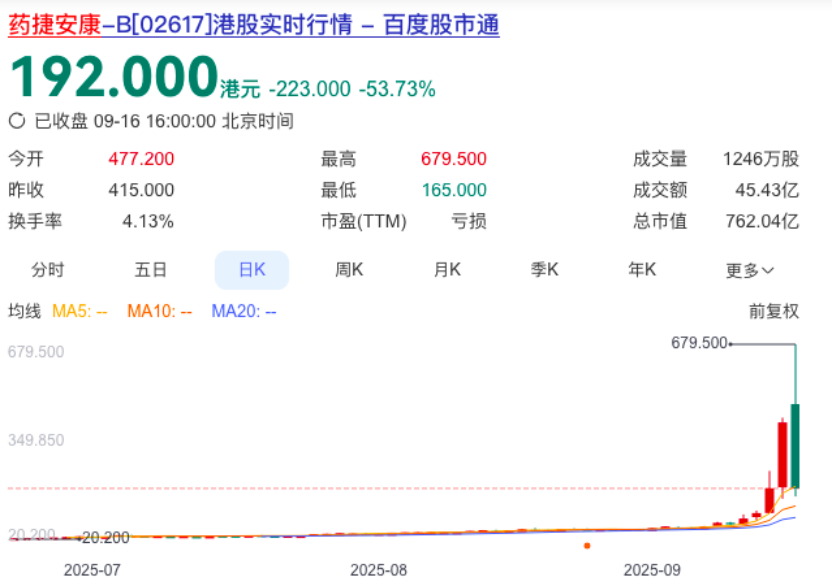 自9月10日以来过去五个交易日涨幅超过7倍,市值逼近2500亿港元、在港股创新药新“二哥”位置上“拳打”信达、“脚踢”康方,狂得没边了的药捷安康,今天突然被打回“原形”。